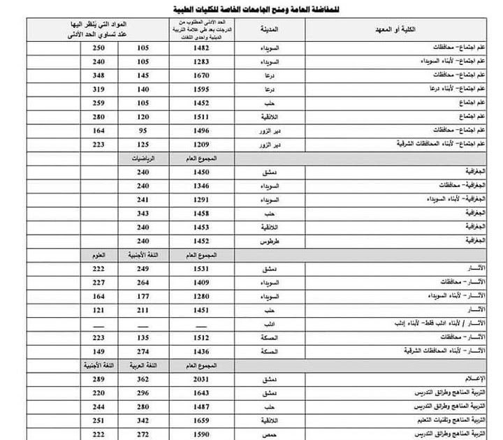 وأشارت الوزارة في إعلانها إلى أنه يمكن الاطلاع على النتائج والحدود الدنيا لمجموع الدرجات المطلوبة للتسجيل في الجامعات والمعاهد للعام الدراسي 2023-2024 من خلال موقعها الإلكتروني، مبينة أن نتائج مفاضلة أبناء أعضاء الهيئة التدريسية ومفاضلة السوري غير المقيم ومفاضلة ذوي الاحتياجات الخاصة ستصدر خلال يومين.
