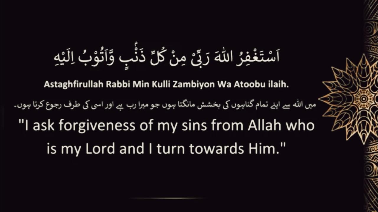 Transliteration: Astaghfirullah rabbi min kulli zambiyon wa atoobu ilaiyh Translation: I ask forgiveness of my sins from Allah who is my Lord and I turn towards Him. Allah sent a message to Prophet Muhammad (ﷺ) in Surah Muhammad ayat 19 and reminded him, "So know, [O Muhammad], that there is no deity except Allah and ask forgiveness for your sin and for the believing men and believing women.