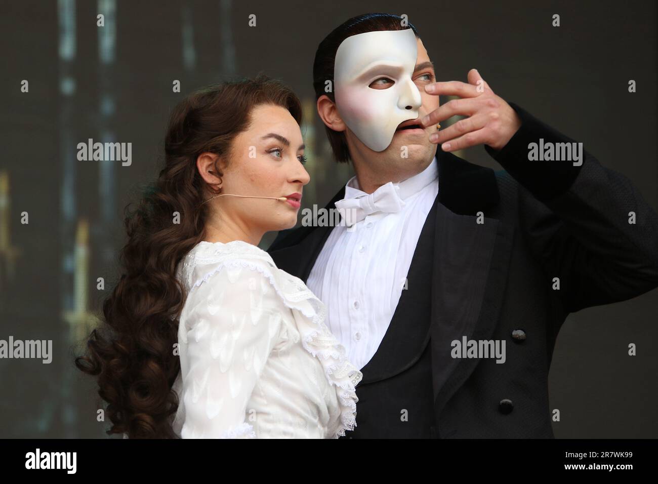 Die Besetzung von Phantom of the Opera tritt live auf der Bühne des West End Live 2023 im