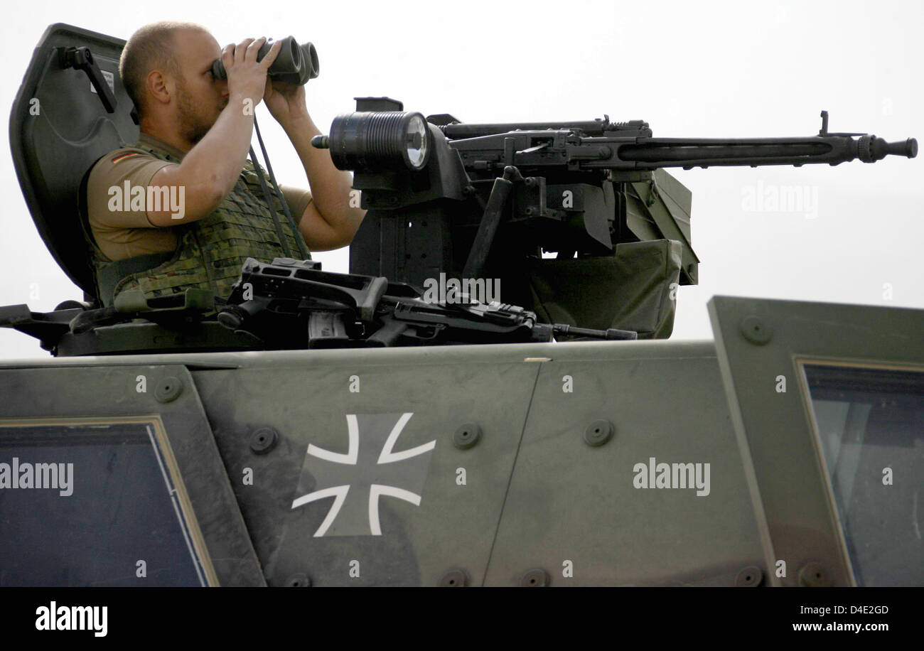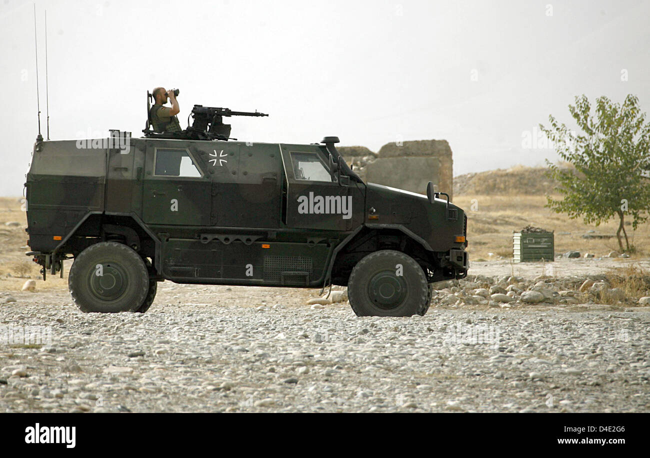 A German Bundeswehr soldier monitors the area around Bundeswehr camp in Feyzabad, Afghanistan