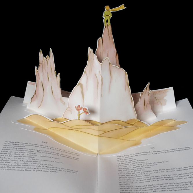 Der Kleine Prinz interaktiv und mit vollständigem Text. In diesem Buch steht der Kleine Prinz tatsächlich auf und kommt uns fast entgegen, die Bergspitze schnellt in die Höhe, damit der Kleine Prinz darauf steigen kann.