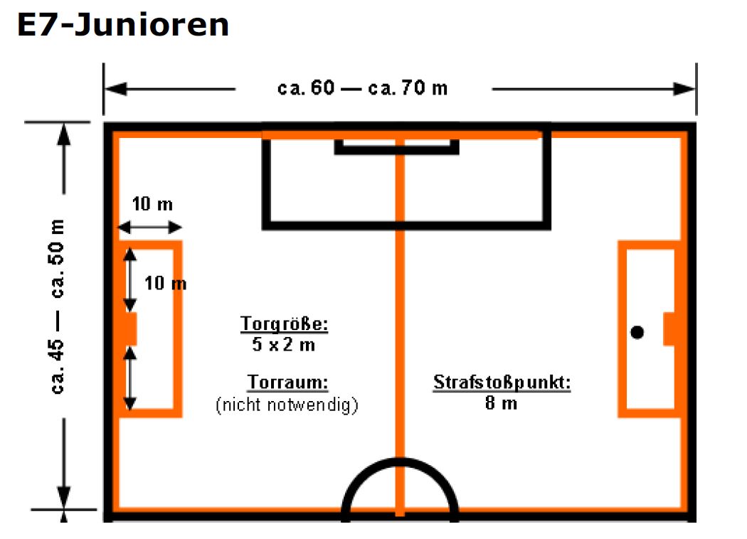 Die Spieldauer in der E-Jugend beträgt in der Regel 2x 20 Minuten, um den jungen Spielern genügend Pausen zu ermöglichen. Die Spielfeldgröße ist kleiner als bei den Erwachsenen, üblicherweise etwa 55 bis 68 Meter lang und 35 bis 45 Meter breit. Anstelle von 11 Spielern spielen in der E-Jugend nur 7 Spieler inklusive Torwart auf dem Platz.