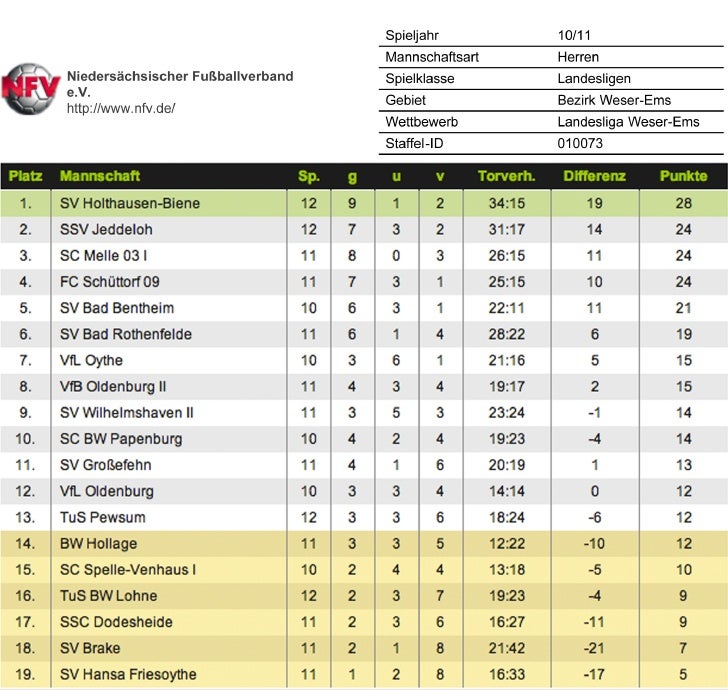 Tabelle SC Melle 03 Fussball Landesliga WeserEms 12. Spieltag