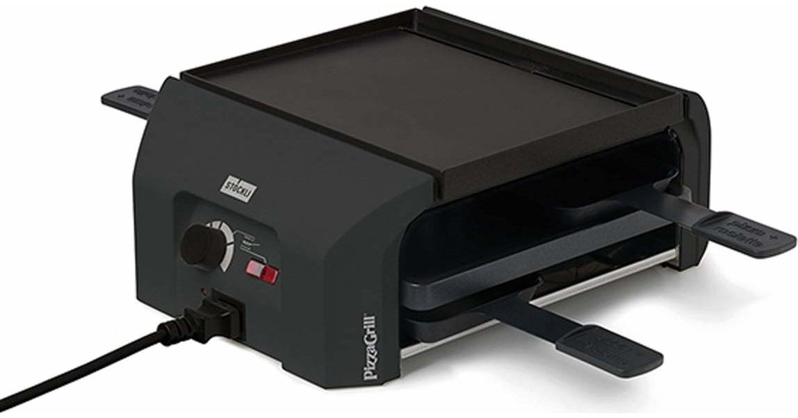 4. Stöckli Pizzagrill FourFour. Basisgerät und Endgerät für 8 Personen mit den Funktionen Pizza, Grill und Raclette. Ober- und Unterhitze bei beiden Geräten separat stufenlos regulierbar, Grillplatte Aluguss antihaft versiegelt, inkl. 8 Pfännchen antihaft versiegelt, 8 Kunststoffspachtel und Teigausstecher. Geniessen Sie mit Freunden und Familie ein gelungenes Essen mit dem Stöckli.