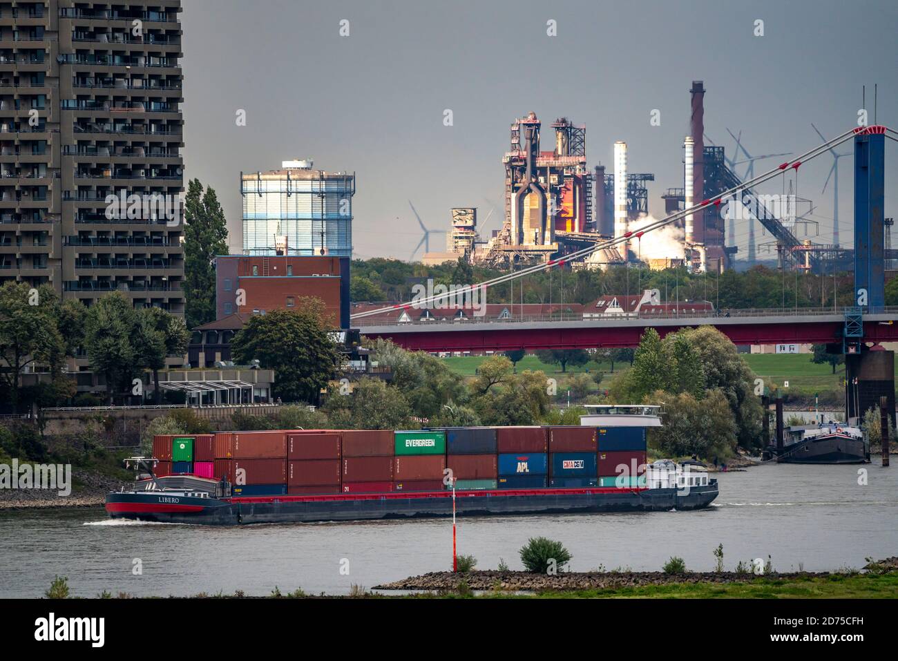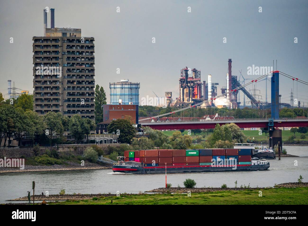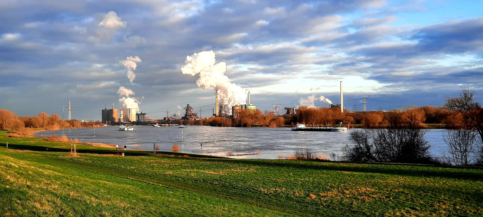 Rhein bei Duisburg, Bank bei DuisburgHomberg, dahinter das Stahlwerk thyssenkrupp in Duisburg